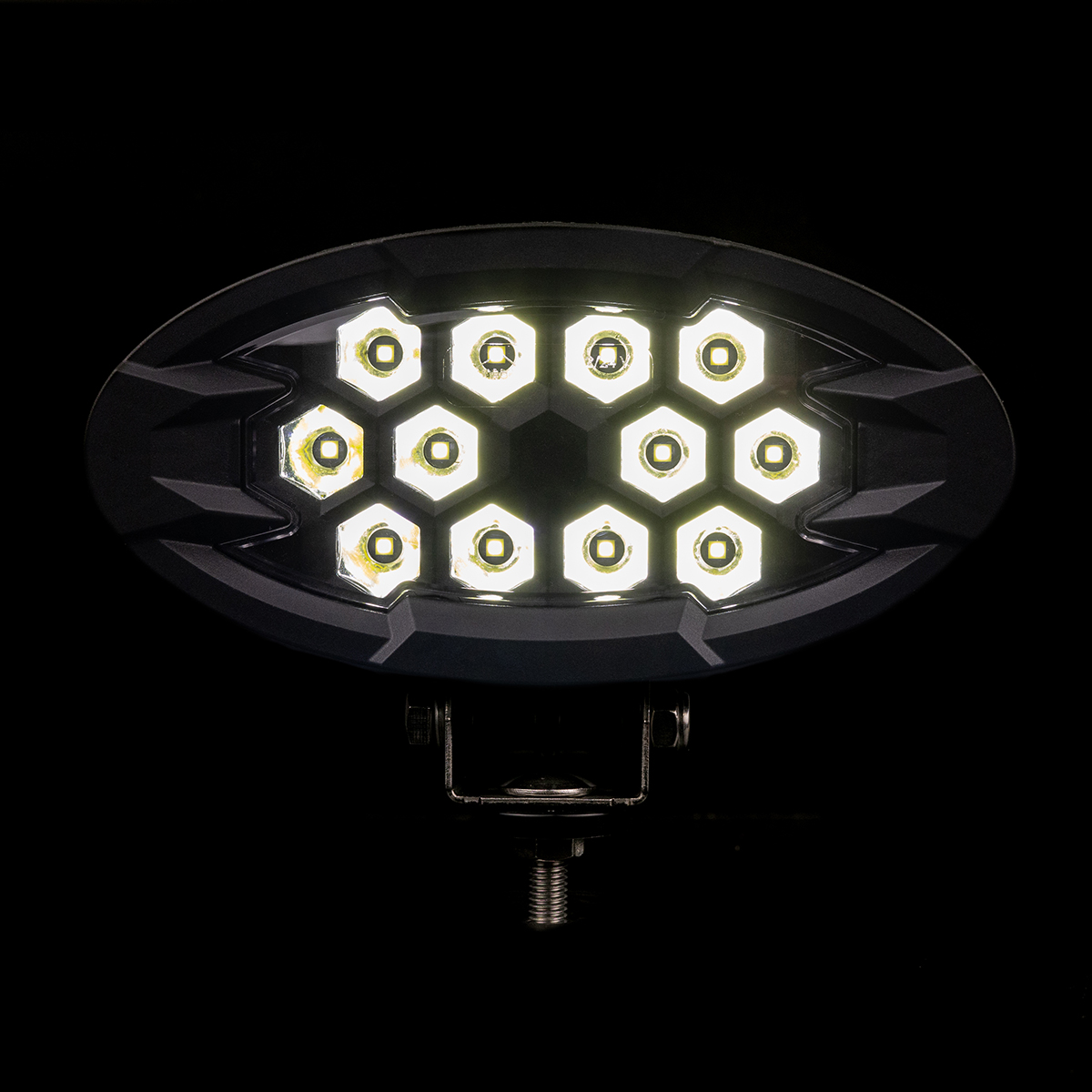 Owalna konstrukcja z czarną kratką zapewnia skoncentrowany strumień światła, który doskonale oświetla obszar roboczy, jednocześnie eliminując efekt oślepienia.