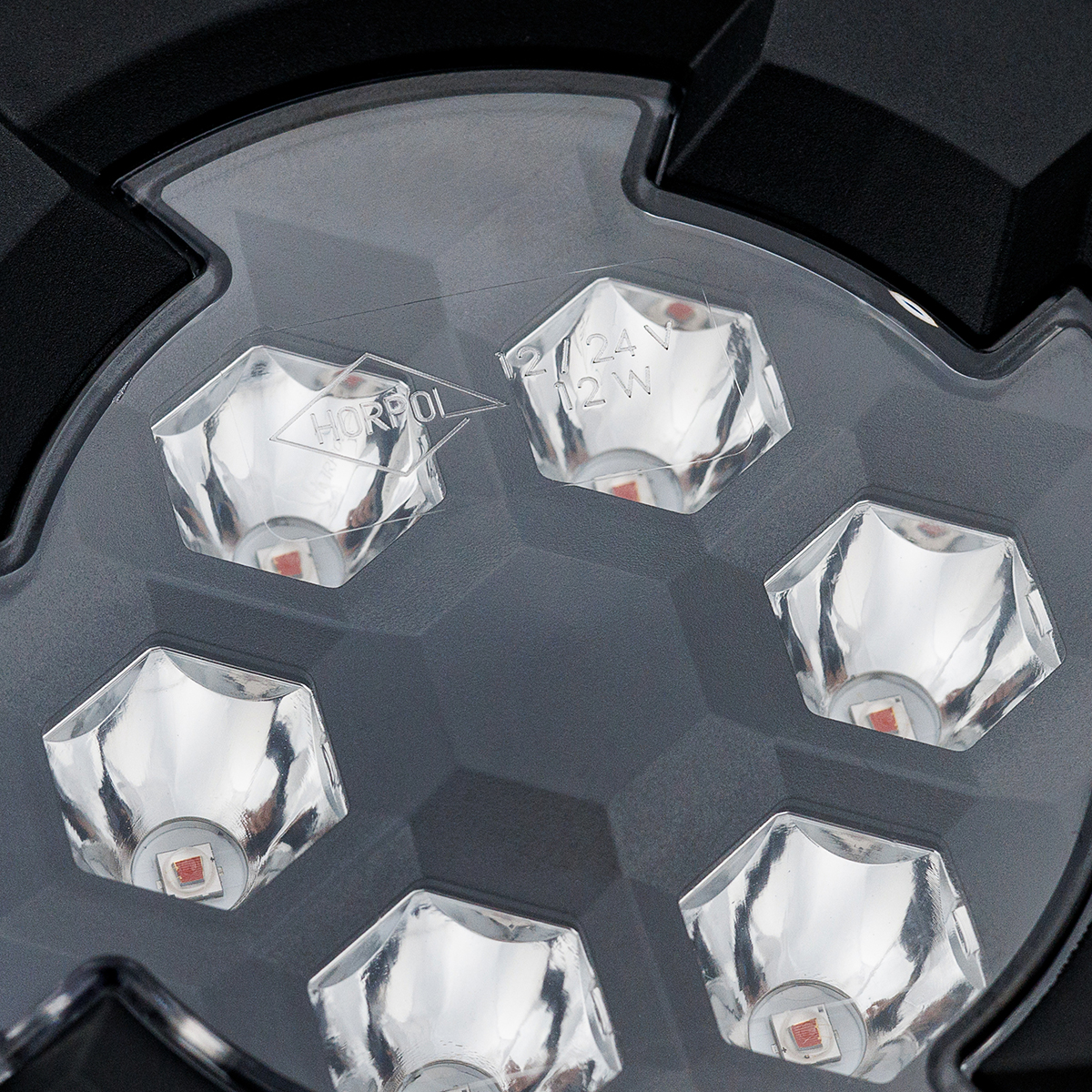 Dzięki technologii LED o mocy 12 W urządzenie generuje intensywny strumień świetlny 650 lumenów przy długości fali 630 nm, co zapewnia doskonałą widoczność czerwonego punktu na podłożu. Wbudowane 6 diod LED pracuje stabilnie zarówno przy napięciu 12 V, jak i 24 V, co czyni lampę uniwersalną i odpowiednią dla większości typów pojazdów magazynowych.