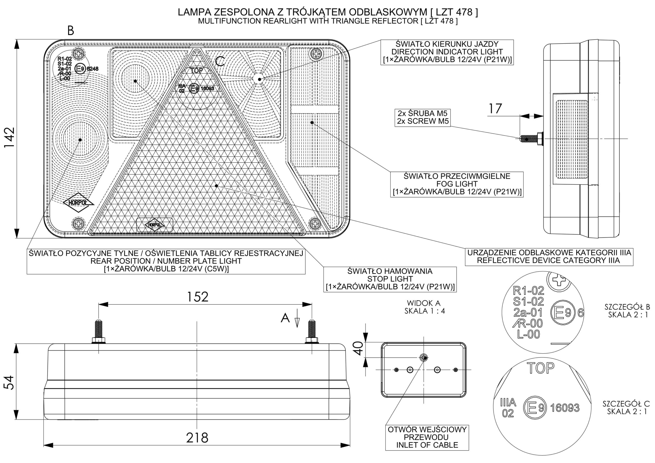 Lampa zespolona tylna z trójkątem odblaskowym HOR 45, pojedynczy kierunkowskaz, prawa