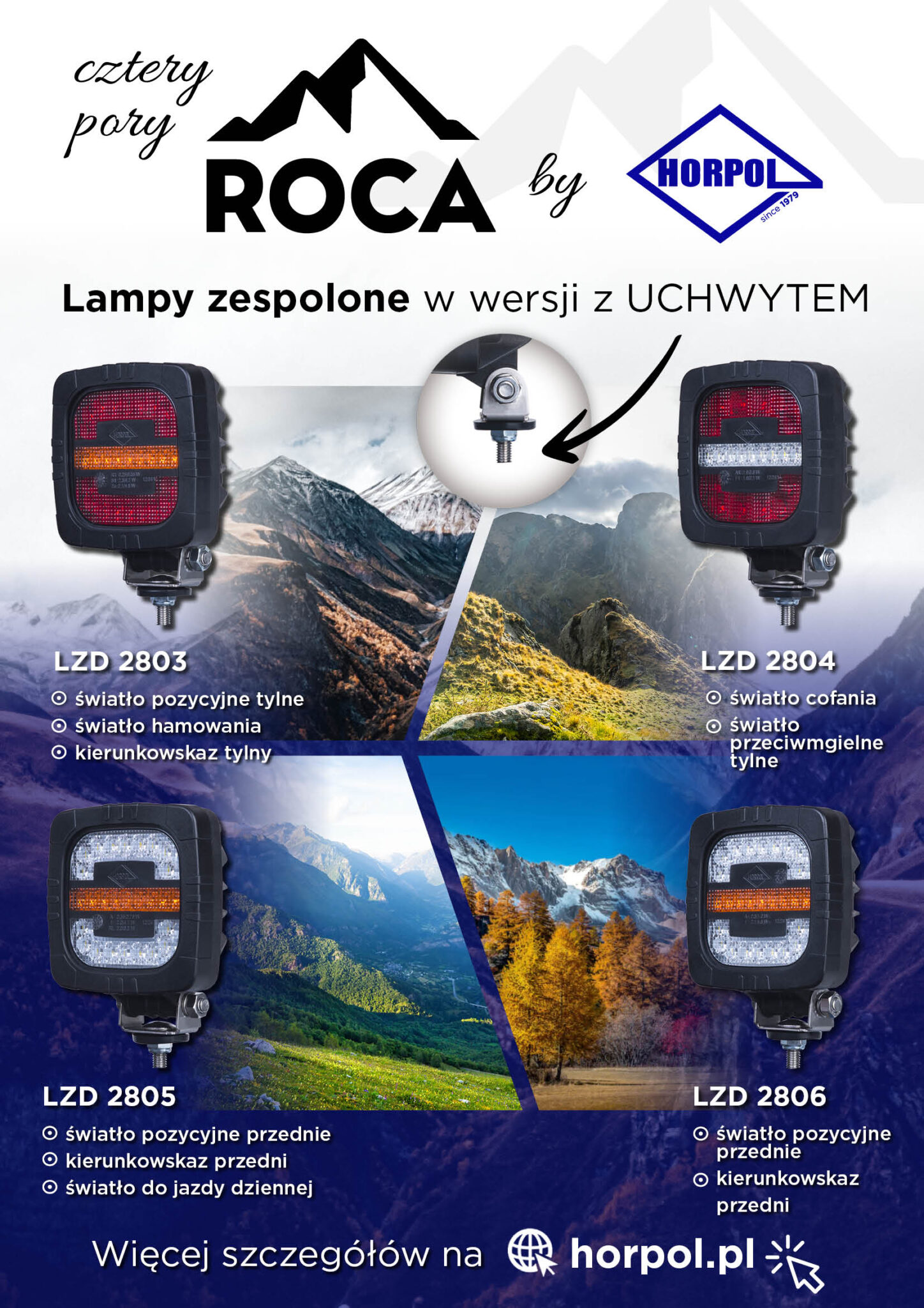 Seria lamp zespolonych ROCA została poszerzona o modele ze specjalnym uchwytem, który pozwala na stabilne mocowanie oświetlenia w trudno dostępnych miejscach. Przechylana podpora zapewnia możliwość zmiany kąta pochylenia lampy, a tym samym kierunku światła. Lampa ROCA LZD 2804 jest przeznaczona do montażu z tyłu pojazdu i łączy w sobie funkcje: