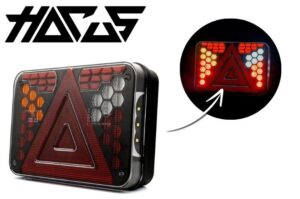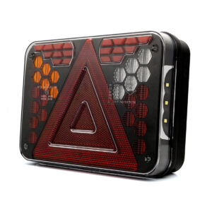 HORUS LZD 3215 to nowoczesna tylna lampa zespolona przeznaczona do przyczep samochodowych, rolniczych oraz specjalistycznych, zaprojektowana w kompaktowych gabarytach i z myślą o maksymalnej trwałości. Konstrukcja lampy opiera się na pojedynczych, precyzyjnie uformowanych modułach geometrycznych, które tworzą spójną i efektowną kompozycję świetlną na tle głębokiej czerni korpusu. Całość zabezpieczono wytrzymałym, przezroczystym kloszem z poliwęglanu, odpornego na uszkodzenia mechaniczne oraz pracę w trudnym środowisku.