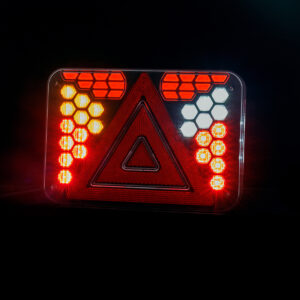 Istotnym elementem konstrukcyjnym lampy jest charakterystyczny trójkąt odblaskowy, wykonany w formie trzech przestrzennych płaszczyzn ułożonych na różnych poziomach. Nadaje to lampie wyjątkową głębię i nowoczesny wygląd, niespotykany w tradycyjnych rozwiązaniach tego typu. Całość uzupełnia geometryczny układ segmentów LED oraz wyraźne światło pozycyjne NEON, zapewniające jednoznaczną i czytelną sygnalizację świetlną.