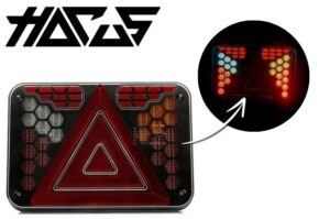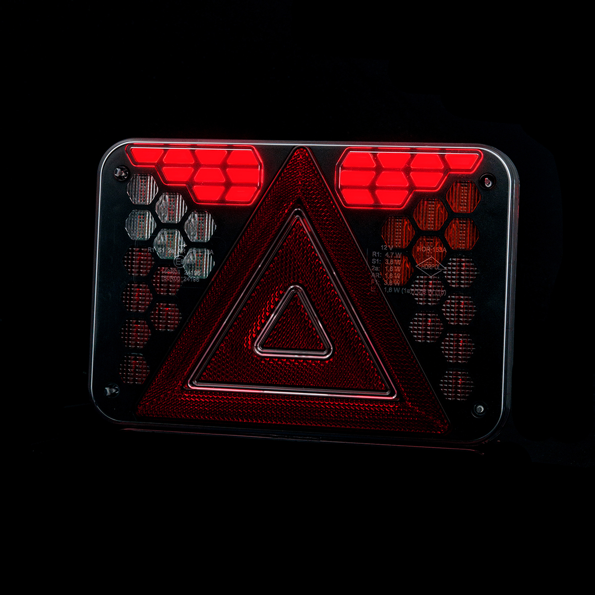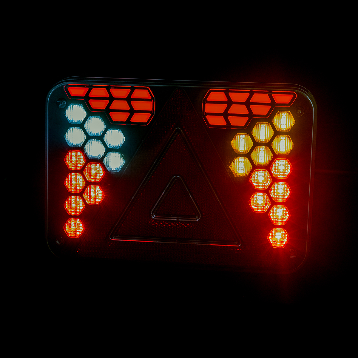 Jednym z najbardziej wyróżniających się elementów lampy jest trójkątny odblask o przestrzennej budowie, składający się z kilku poziomów ułożonych w różnych płaszczyznach. Taka forma nadaje lampie głębi i nowoczesnego charakteru, wyraźnie odróżniając ją od standardowych rozwiązań. Całość uzupełnia dynamiczny układ segmentów LED oraz wyraźne światło pozycyjne typu NEON, zapewniające bardzo dobrą widoczność i czytelność sygnałów świetlnych.